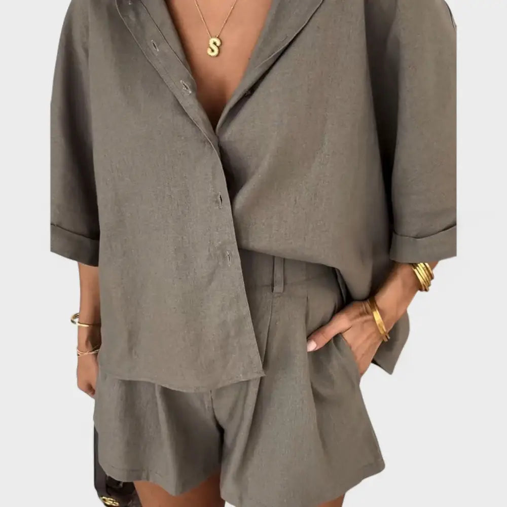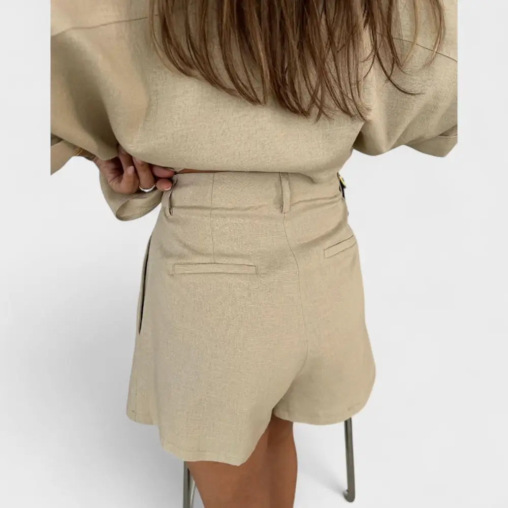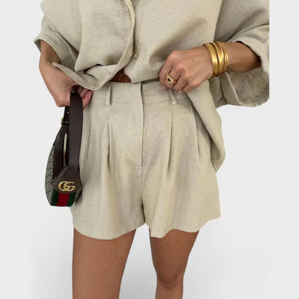 Ligereza y estilo para tu día a día. Ligero, femenino y atemporal: el conjunto Claudia™ es tu nuevo imprescindible para los días soleados. Combina una blusa oversize fluida con shorts de tiro alto en tonos tierra, perfectos para lograr looks relajados sin renunciar al estilo. Ideal para tus vacaciones de verano, este conjunto se adapta a cualquier ocasión, desde un paseo casual hasta una salida elegante.